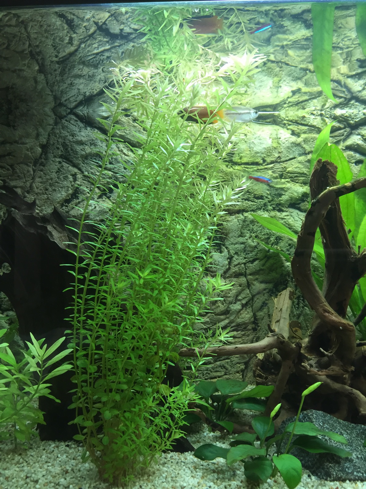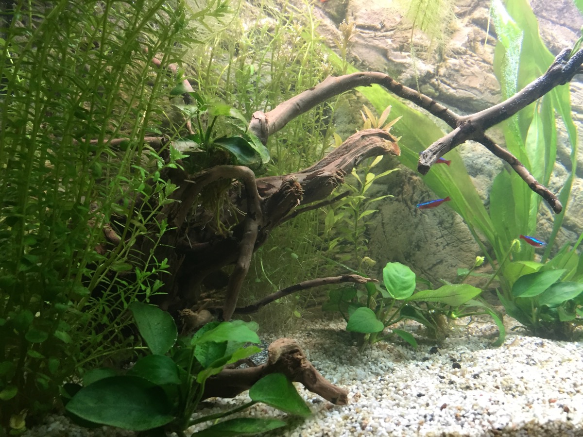 Alkuun pintakasvit pyörivät harmillisesti ympäri allasta pienestä virtauksesta ja suunnan hakemisesta huolimatta, joten viritin langan lähelle pintaa sopivaan kohtaan poikki akvaarion. Nyt kasvit pysyvät toisessa päässä tuoden lisää suojaa rihmisten iloksi.
