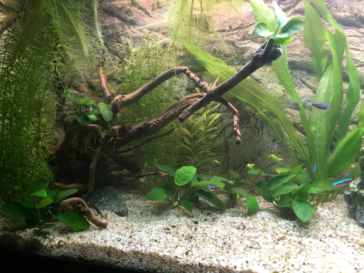 Alkuun pintakasvit pyörivät harmillisesti ympäri allasta pienestä virtauksesta ja suunnan hakemisesta huolimatta, joten viritin langan lähelle pintaa sopivaan kohtaan poikki akvaarion. Nyt kasvit pysyvät toisessa päässä tuoden lisää suojaa rihmisten iloksi.