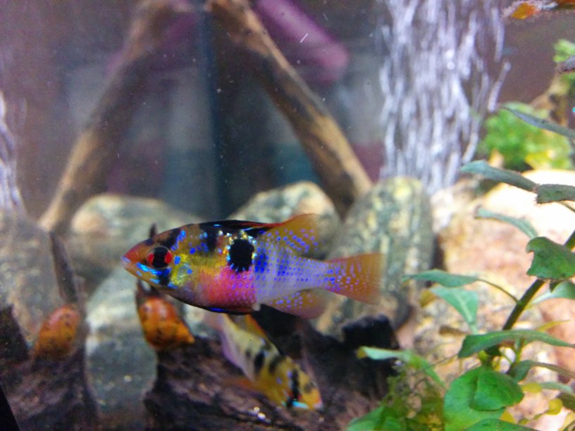 Vaihteenvuoksi loistokääpiöahven koiras, joka koostaan huolimatta on melko pippurinen tyyppi. Nopein kala mikä akvaarioista tällä hetkellä löytyy.