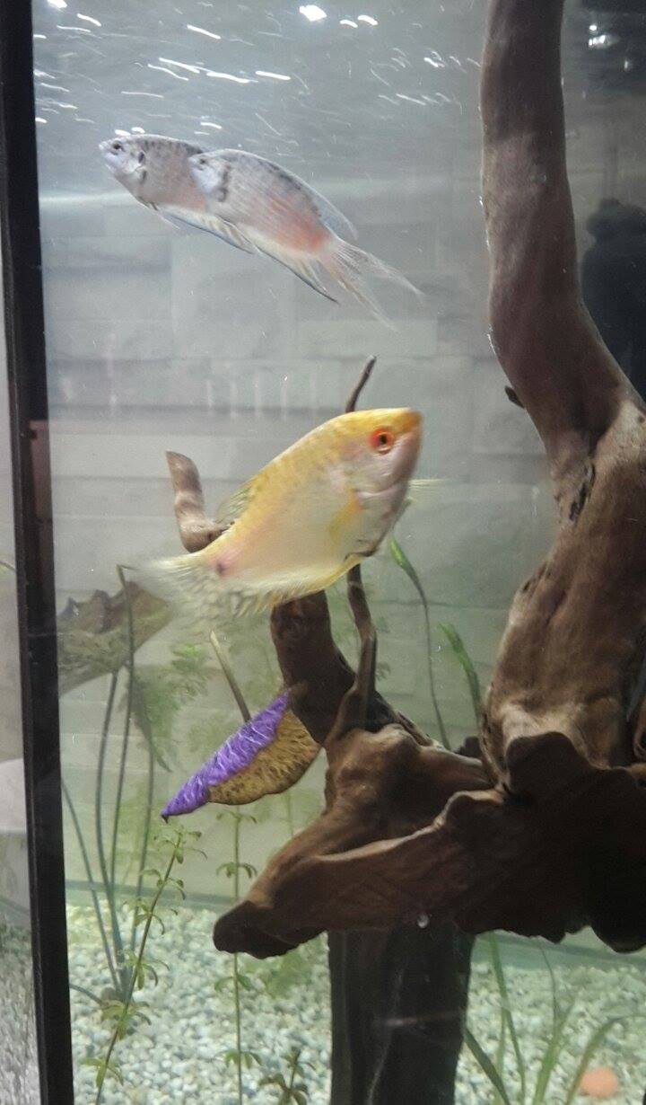 Koetetaan jos saadaan uusi ketju aikaiseksi. Taistelukaloille on oma kuvaketju, miksei siis myös yhtä muille labyrinttikaloille. Aloitan perinteisen sumealla tyylilläni kuvatulla kuvalla paratiisikala parista. Koiras rakentaa kovaa vauhtia vaahtopesää ja kosiskelee naaraita. Kirkkaassa valossa kalan värit ovat hätkähdyttävän voimakkaat mutta hämärässäkin evät kosiskeluun levitettynä se on hieman suurempana helppo erottaa.