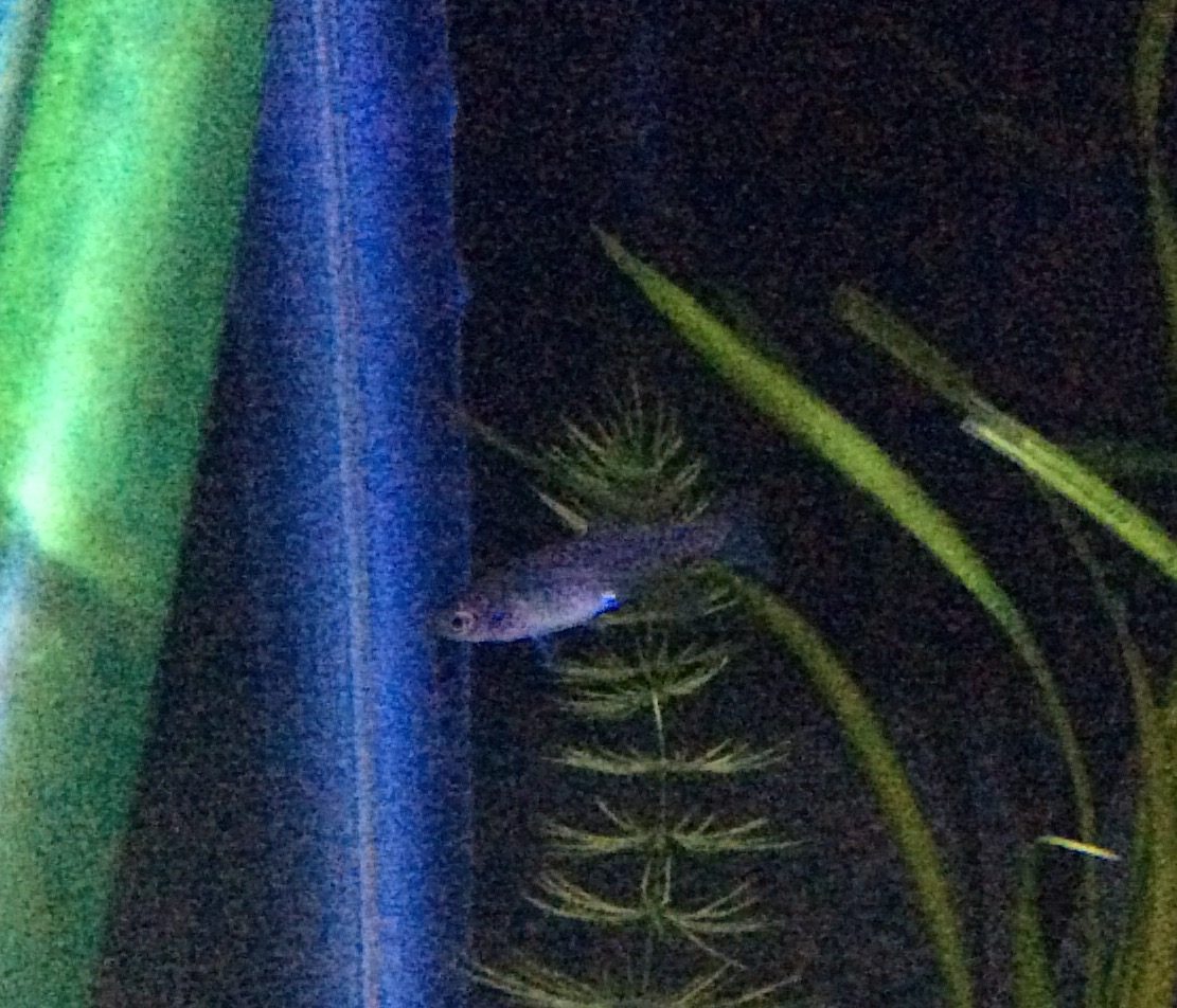 Kun lähdimme kahdeksi viikoksi matkalle, siirsin 3 - 4 -viikkoiset poikaset isoon akvaarioon. Vain kaksi oli jäljellä. Toinen oli iso, toinen ihan pieni. Pieni ehkä joutui isosiskon suuhun loman aikana. Mutta isosisko oppi syömään automaattiruokaa, koska pysyi hengissä.
