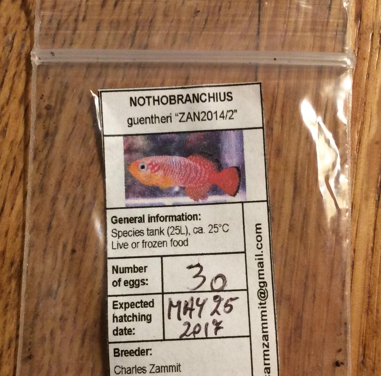 Munia oli noin 20, ja laji oli Nothobranchius guentheri (ZAN 2014/2). Munat alkoivat kuoriutua taikinakulhossa kahden vuorokauden jälkeen. Nostin poikaset pipetillä karkki-astiaan (noin 20x20 cm). Siellä oli joulusammalta piilopaikkana poikasille ja likoeläimille kasvualustana. Ruokin poikasia Hobby Protogen alkueläimillä ja mikromadoilla.
