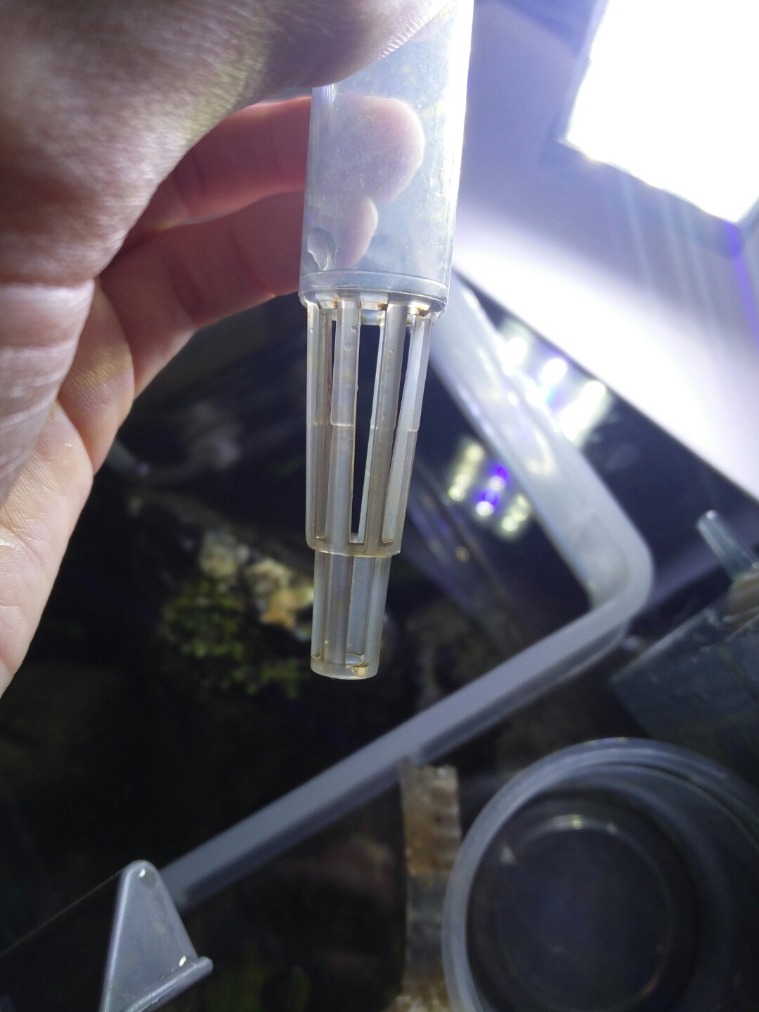 Leikkasin puhdistussienestä ohuen kaistaleen ja tein siitä ja ompelulangasta patentin imuputken aukkojen päälle. Täytyy nyt joka päivä tarkistaa kuitenkin tuo suodatin siltä varalta että joku on löytänyt sukaravun mentävän kolon. Hyvältä muuten vaikutti tuo viritys, vesi menee hyvin sisään.