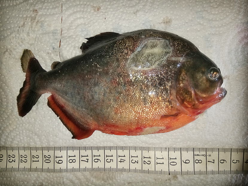 Eipä ollut enää tästä yksilöstä eläjäksi. Makaili vain pohjalla kyljellään, eikä pystynyt enää uimaan. Pakko oli lopettaa kärsimykset. Alkuun katselin kalan kylkiä lasin läpi ja oletin että nahka on vain nirhaantunut vähän eikä sen suurempia vammoja ole tullut. Nyt vasta näin kuinka nahka oli käytännössä hävinnyt paikoitellen kokonaan ja lihat olivat jo esillä. Saattanut ehtiä olla jumissa pidemmänkin aikaa. Täysin terve kala ennen jumiutumista juurakkoon. Seitsemän kuukauden ikäinen. Hyvä on ollut kasvuvauhti pienestä kolikon kokoisesta poikasesta 16,5cm pituuteen. Parvessa on vielä 15kpl samankokoisia yksilöitä keskikooltaan.