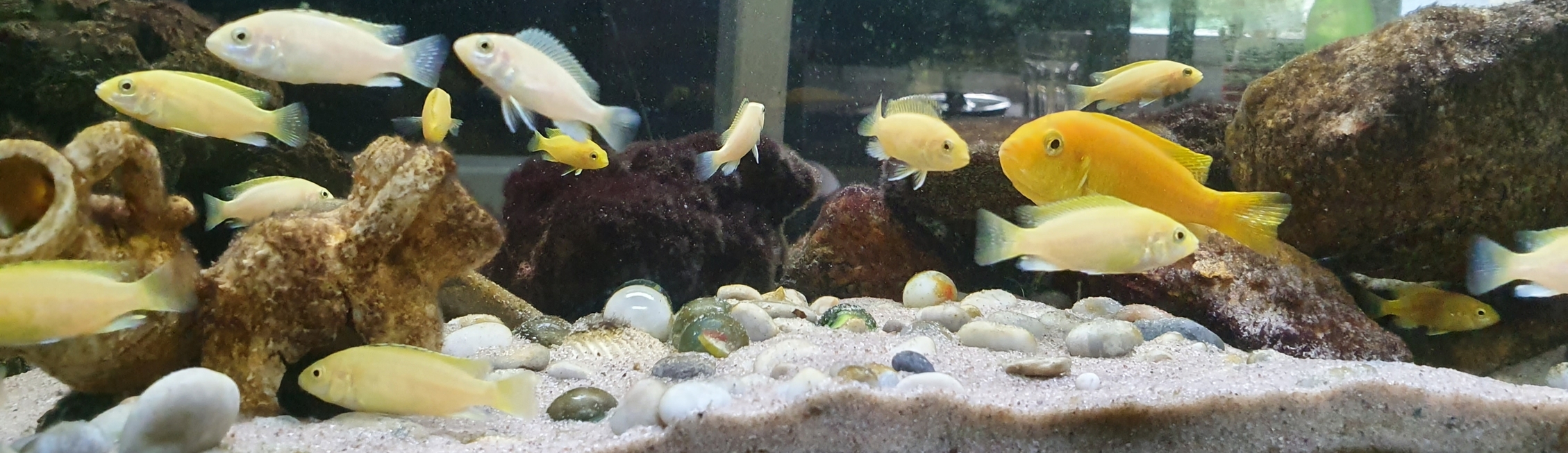 Myynnissä akvaarion liikakansoituksesta johtuen vajaa parikymmentä kappaletta Yellow lab eli Labidochromis caeruleus -poikasia, kooltaan pääosa noin 3-4 cm. Kuvassa poikaset ja äiti, osa poikasista jo selvästi keltaisia, osa valkoisia.