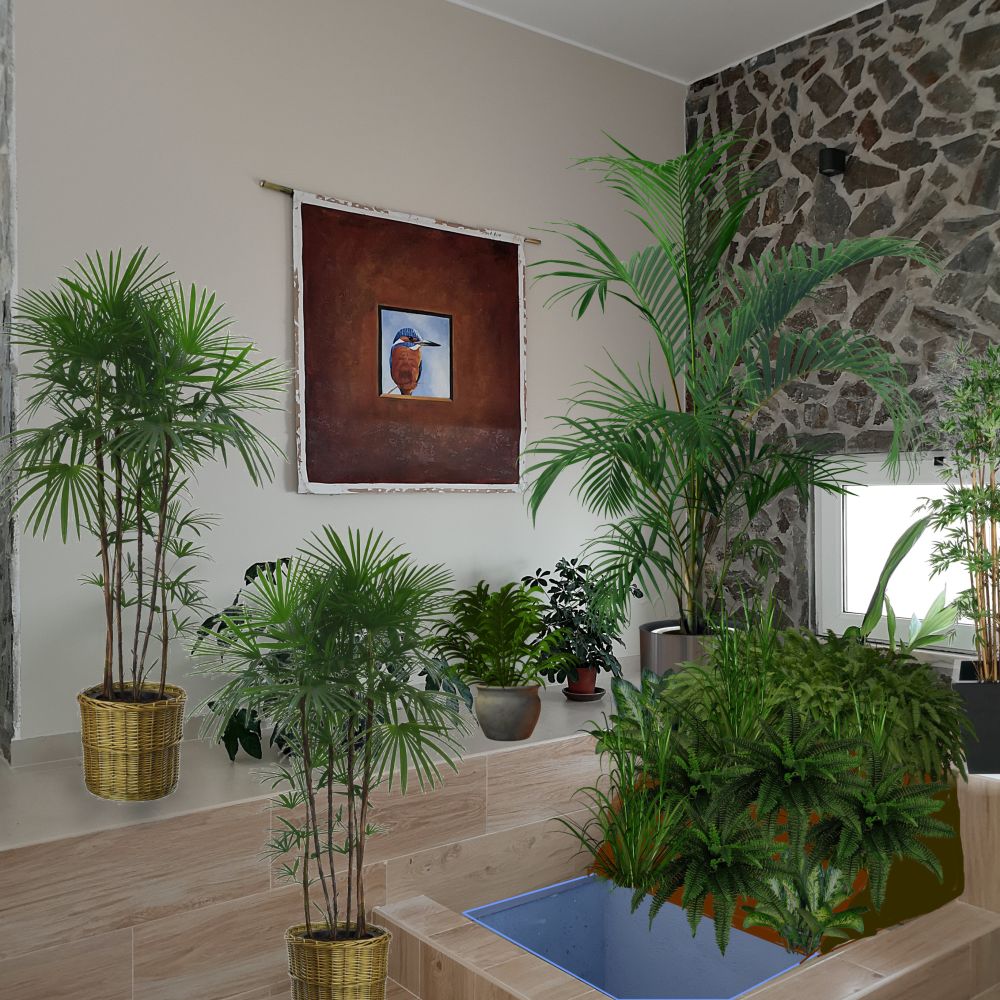 Nyt täytyy antaa hieman lisätietoa: Talo sijaitsee Portugalissa. Tällä paikalla oli ennen remonttia sisäuima-allas, joka nyt on typistynyt tuollaiseen kuvan "oleskelukuoppaan", joka on vielä ilman jonkinlaista löhöämissisustusta. Ympärillä on valoisaa lattiatilaa 40 neliötä ja korkeutta suurimmalta osin 5 metriä. Tähän on tarkoitus sisustaa talvipuutarha. Paljon kasveja on siis tulossa. Kosteutta voidaan hallita ilmastoinnilla. Meillä sisäilmankosteus heiluu normaalisti 60%:n tietämillä ja talvella asteita on ilman lämmitystä noin +15. Mittasin vesiosan uudelleen ja 100 litraa putosi pois. Syvyys on 80 senttiä ja laidat 90 x 70 senttiä. Rinnalla on tila ulkosuodattimelle.