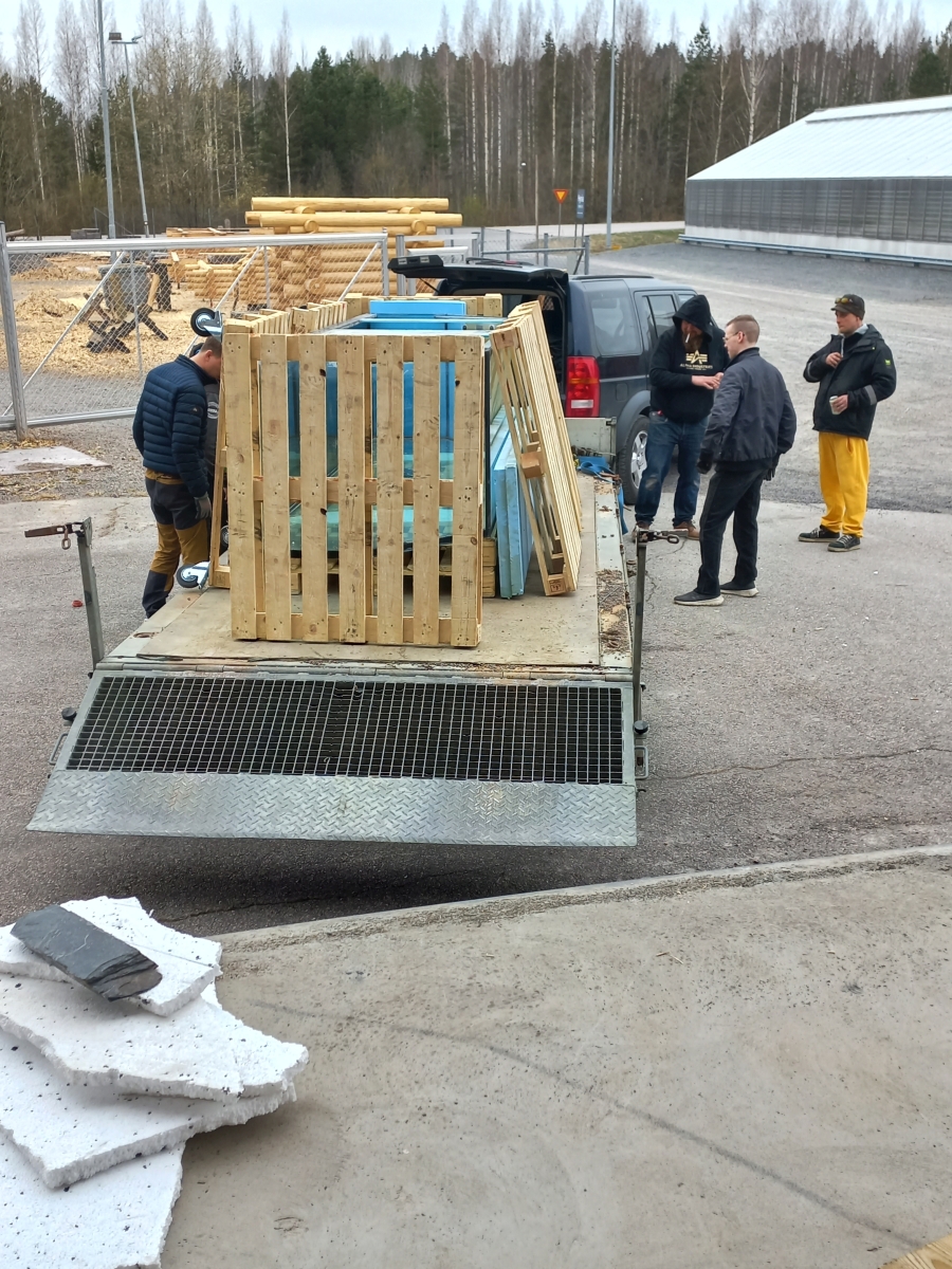 Trailerissa on kippi ja tuollainen ajoramppi eli me laitettiin rivi lavoja joiden päälle uretaanilevyjen paloja joita pitkin tuo oli aika helppo porukalla liu-uttaa kyydistä pois.