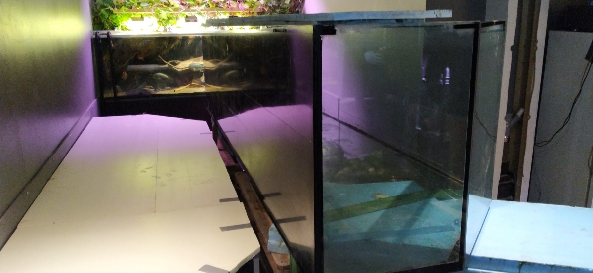 Akvaario hivuteltiin totuttuun tapaamme lava ja pääty kerrallaan samalle korkeudelle kuin pöytä, tällä kertaa viimeisen kerran \o/