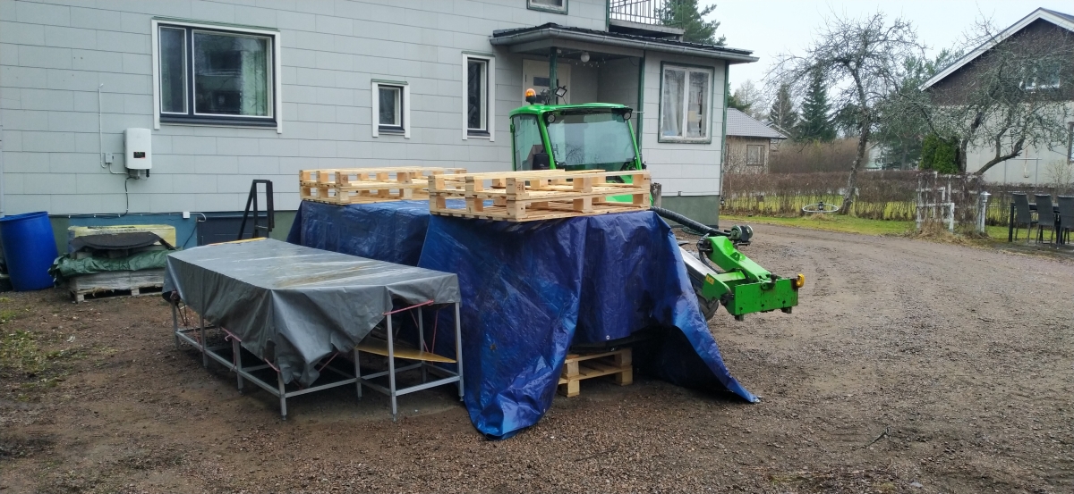 Lopuksi uretaanit sekä pressu päälle ja pari lavaa painoksi jotta tuuli ei vie pressua.