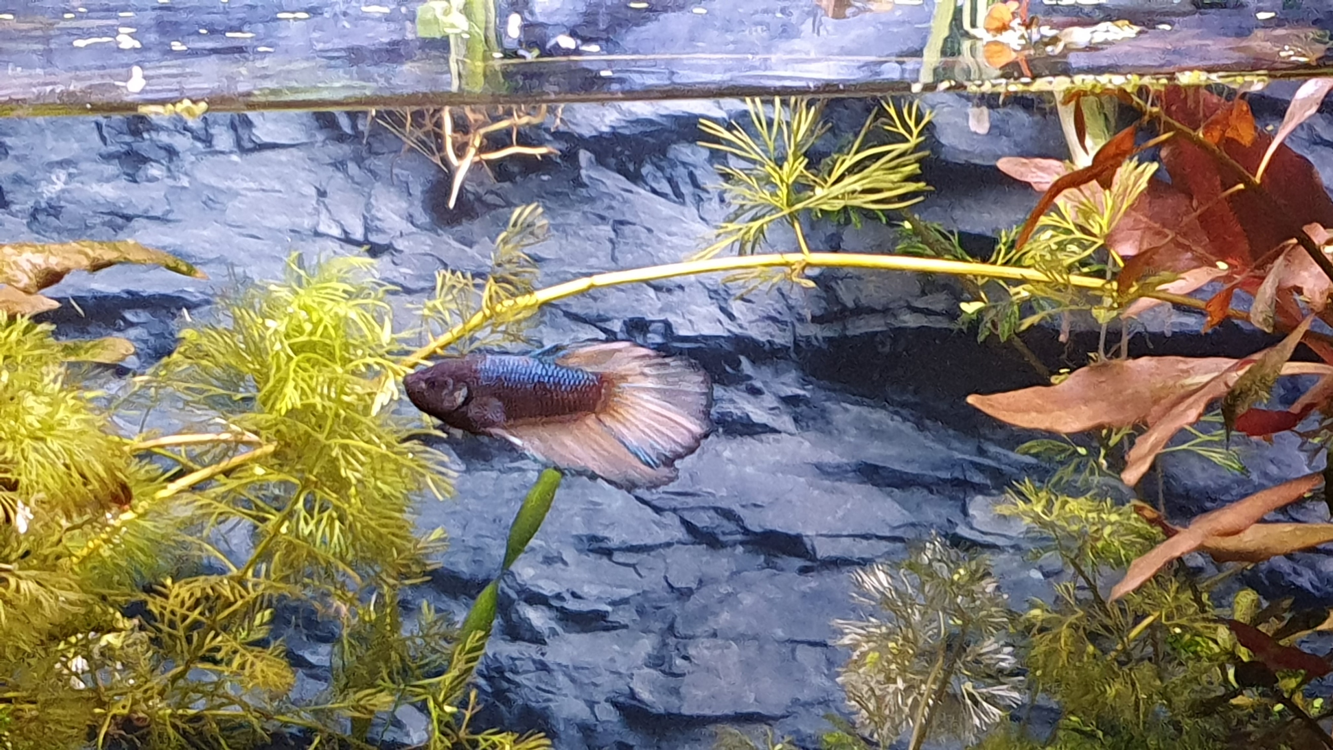 Mutta tuo kala vaikuttaa minusta aika älykkäältä ja vilkkaalta ja se olisi sopiva kanditaatti opettaa jotain temppujakin. En vain mahda jaksaa.. Sen naama on minusta vähän söpömpi kuin normaalisti, sillä ei ole niin yrmeä suu kuin useimmilla taistelukaloilla on. Silmät ovat hieman pienemmät kuin "luisevammilla malleilla", hah. Sillä on juuri sopivan mittaiset evät, minusta ne näyttää aika pitkiltä, mutta eivät ole täysin liehuvat, jotka haittaa kalan uintia. Tämä on todella nopea ja aktiivinen uimari, eikä sen pitkähköt evät tunnu häiritsevän onneksi yhtään sen menoa. Se on juuri sopivan värinen minun altaaseen, se ei ole liian korea, eikä liian ruma. Se on täsmälleen sopiva ja ilman tuon kalan aktiivista käytöstä, en olisi ottanut sitä edes mukaan kaupassa. Mietin vain taikauskoisesti, että ehkäpä tuo kala halusikin mukaan kaupasta kun yritti herättää huomioni. Se näytti paljon rumemmalta kaupan karussa altaassa, tuossa altaassa se on tosi komea. a