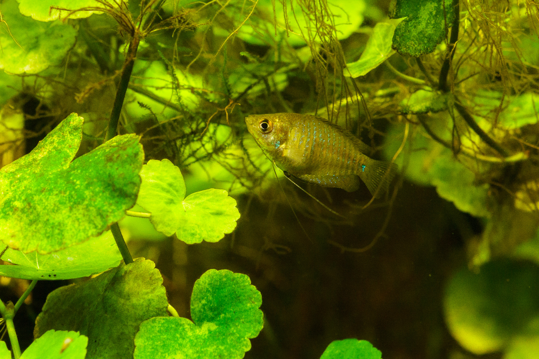 Lämpötilaa nostin taas asteella. Nyt päivällä täydet 30 ja yöllä 28. Tästä en enää nosta, vaan pidän näissä lämmöissä kunnes ovat jokseenkin täysikasvuisia, jolloin voi tiputtaa muutamalla asteella. Vesisaniaiset ovat valloittaneet akvaarion. Ilmeisesti imevät ravinteita niin paljon, että pistia ja konnanputki kasvavat huonosti.
