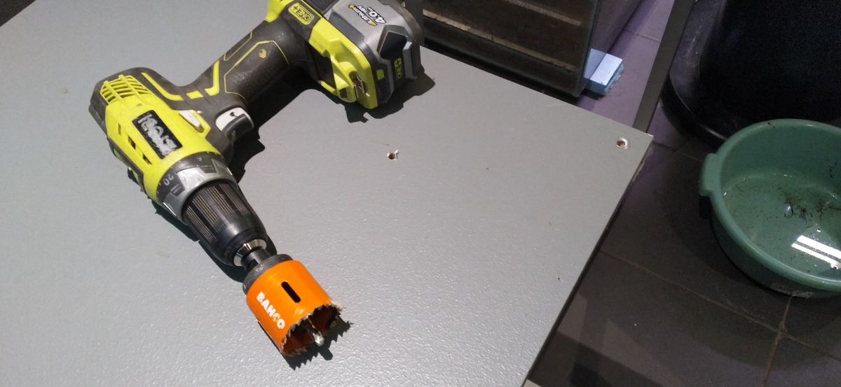 Työkaluna on porakone mihin sopivan kokoinen rasiaporaterä. Sitten vaan mittailemaan jotta reiät tulee kerralla oikeisiin paikkoihin.
