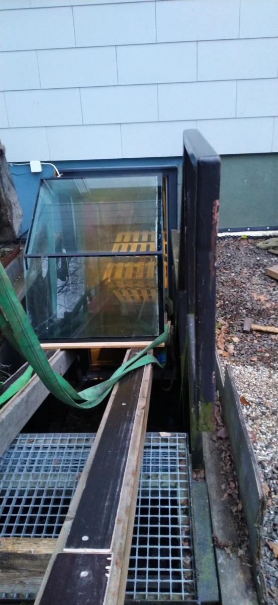 Portaikkoon laitettiin 6m pitkä ramppi mikä oli tehty 6kpl 2x5 palkeista. Sijoitus oli tärkeä kun tilaa ja toleranssia sivuttain oviaukossa oli vain 3cm (akvaario 80cm korkea ja oviaukko 83cm leveä). Rampin pintaan laitoin filmivanerista liukurit jotta allasta ei tarvitsisi väkisin työntää sisälle. Oikeasti siitä tuli hieman liiankin liukas jonka takia jouduttiin jarruttelemaan koko hökötystä.