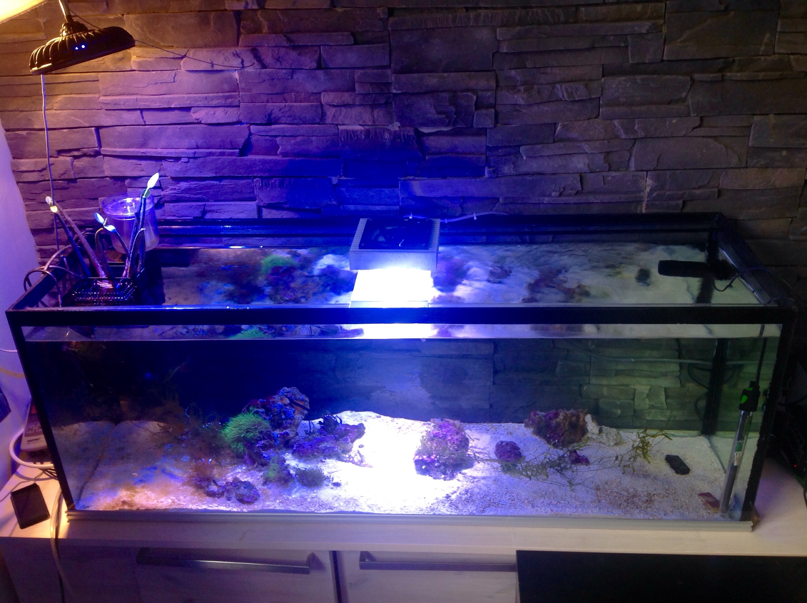 Mulla on siis Juwelin 180l pikku allas vaan ja tällä hetkellä ainoastaan kaksi ledinauhaa takaseinässä. 3000K sarastuvalo ja sininen kuuvalo.