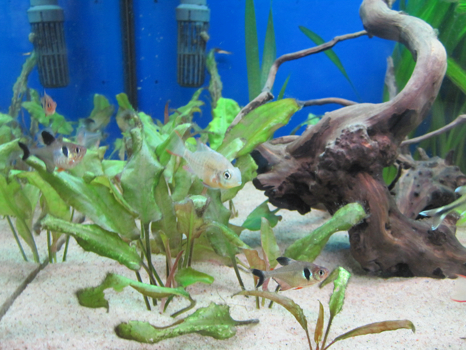 ), 1-2 kuparitetraa alkaa selkäranka vääntyä, ei vielä pahasti ja yksi musta-aavetetra on järkyttävän pullea ollut jo varmaan yli viikon(?). Yleensä, kun on noin voimakkaita oireita niin ei montaa päivää kestä että kala on kanttuvei. Mulla on taktiikka, jonka mukaan jos menee lauman mukana, syö ja on pirteä niin saa olla hengissä, mutta kun jää kökkimään jonnekin yksinään eikä ruoka maistu niin sitten kala autuaammille kalavesille. Toki jos on hirmu isot esim. evärepeämät, niin olen saattanut hiukan aiemmin lopettaa. Muut kalat näyttää aika hyviltä, tosiaan jos alkaa jotain ulkoista oiretta tulla (muuta kuin pientä evärepeämää) niin ei se kauan kestä, että kala on mennyttä.