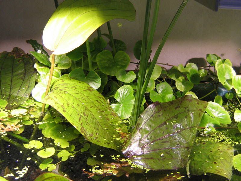Ei kyllä ole mitään muistikuvaa ilmalehtien karvaisuudesta tai karvattomuudesta ja tällä hetkellä altaassa on enää tuo pienin yksilö. Suht jäykät ne ilmalehdet kyllä oli, tanakammat kuin E. cordifoliuksella (pitäis siitäkin ottaa kuva vaikka sen lehdet on kyllä enemmän tai vähemmän repaleina...). Punotusta tuossa on vain ihan lehden kiivaimmassa kasvuvaiheessa ja vähäisemmässä valossa väri jää huomattavasti vaisummaksi.