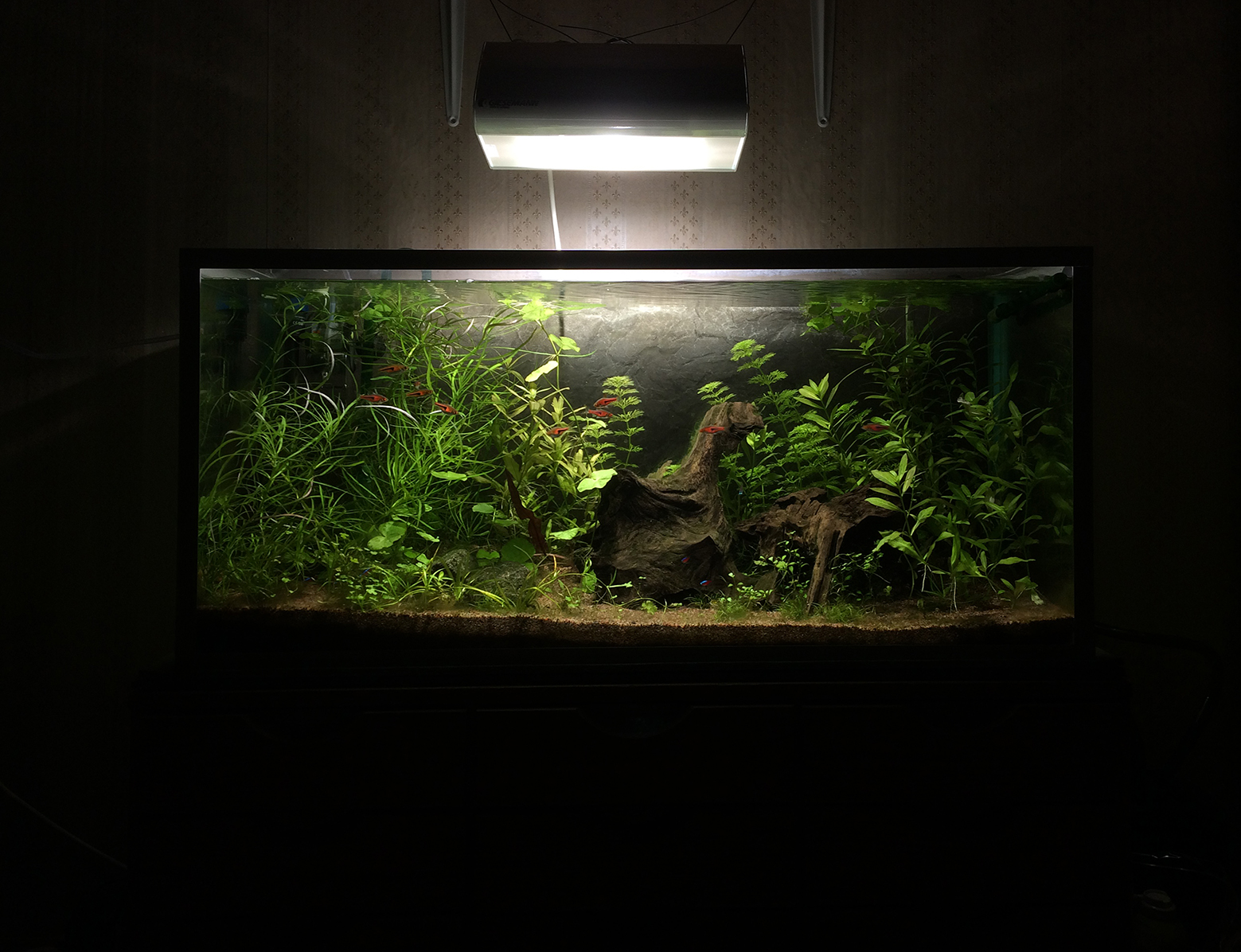 Allas on siis tuollaisen pienen senkin päällä, jonka kyljet ja pohja on varsin paksua vaneria. Kansi on levyä, ja sen päälle olen laittanut vielä vanerin ja solumuovin. Oven ja vetolaatikoiden välissä on vielä keskituki. Akvaario tuntuu olevan tosi tukevasti, mutta koska olen sen verran heikkohermoinen niin vielä harkitsen jotain alumiinijalustaa tälle, vaikka tuohon tuo istuu kuin nakutettu. Pelottaa vain jos huonekalu antaa joskus myöten, mutta kuinka todennäköistä tällainen voi olla? Ennen akvaarion asettamista seisoin senkin päällä niin että aika isojakin pisterasituksia tuli, mutta mitään joustamista tai narinaa en havainnut. Silti, vielä kun homma on alussa eikä mitään ole sattunut niin mietin josko vaihtaisin alustan, ellei sitten saada jotain konsensusta että näin pärjätään..