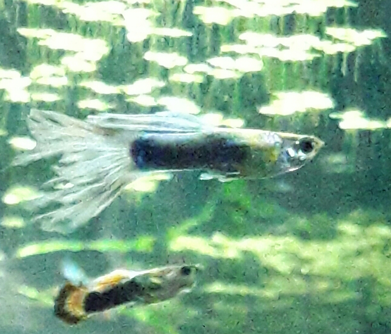 Olisipa aikaa perehtyä noihin periytyvyysasioihin... Kun on sekaparvi kaloja, niin ainakaan minulla ei ole aavistustakaan, mikä naaras kävisi (vai kävisikö mikään) jonkin tietyn koiraan pariksi, että saisi aikaiseksi edes jonkin verran tietynnäköisiä kaloja. Omien kalojeni joukossa lempparini oli alun perin keltainen tuxedo, mutta mukana tulleista poikaista yhdellä on nyt komea cobraväritys. En lakkaa hämmästelemästä värin monipuolisuutta. Musta väri pysyy koko ajan ennallaan, mutta muuten pyrstö on välillä kirkkaan auringonkeltainen, seuraavassa hetkessä hehkuvan oranssi. Pyrstön tyvellä olevasta värilaikusta en ikinä ehdi saada selvää, se vaihtaa niin nopeasti sinisestä vihreään ja takaisin. Ja samaa väriä näyttää olevan kyljilläkin, se vain näkyy ainoastaan tietystä kulmasta. Ihan käsittämätöntä, miten kalan väri vaihtuu, kun se ui eri valaistuksissa ja se näkyy eri katselukulmista. Noita täytyisi ehdottomasti saada lisää.