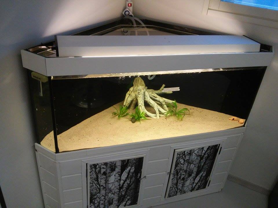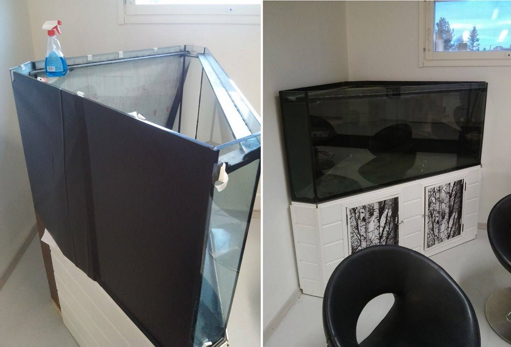 Ostin altaan käytettynä, kauppaan kuului pelkkä allas ilman kansilaseja ja jalusta, jonka toisessa kaapissa on pieni valaisin. Jossain vaiheessa tämä on Helsingistä päin haettu ja mahdollisesti se olisi koulussa rakennettu. Toinen omistaja oli sitten maalannut valkoiseksi ja lätkäissyt dc-fixiä kaapin oviin. Olisikin hauska kuulla jos tästä altaasta joku tietäisi enemmän