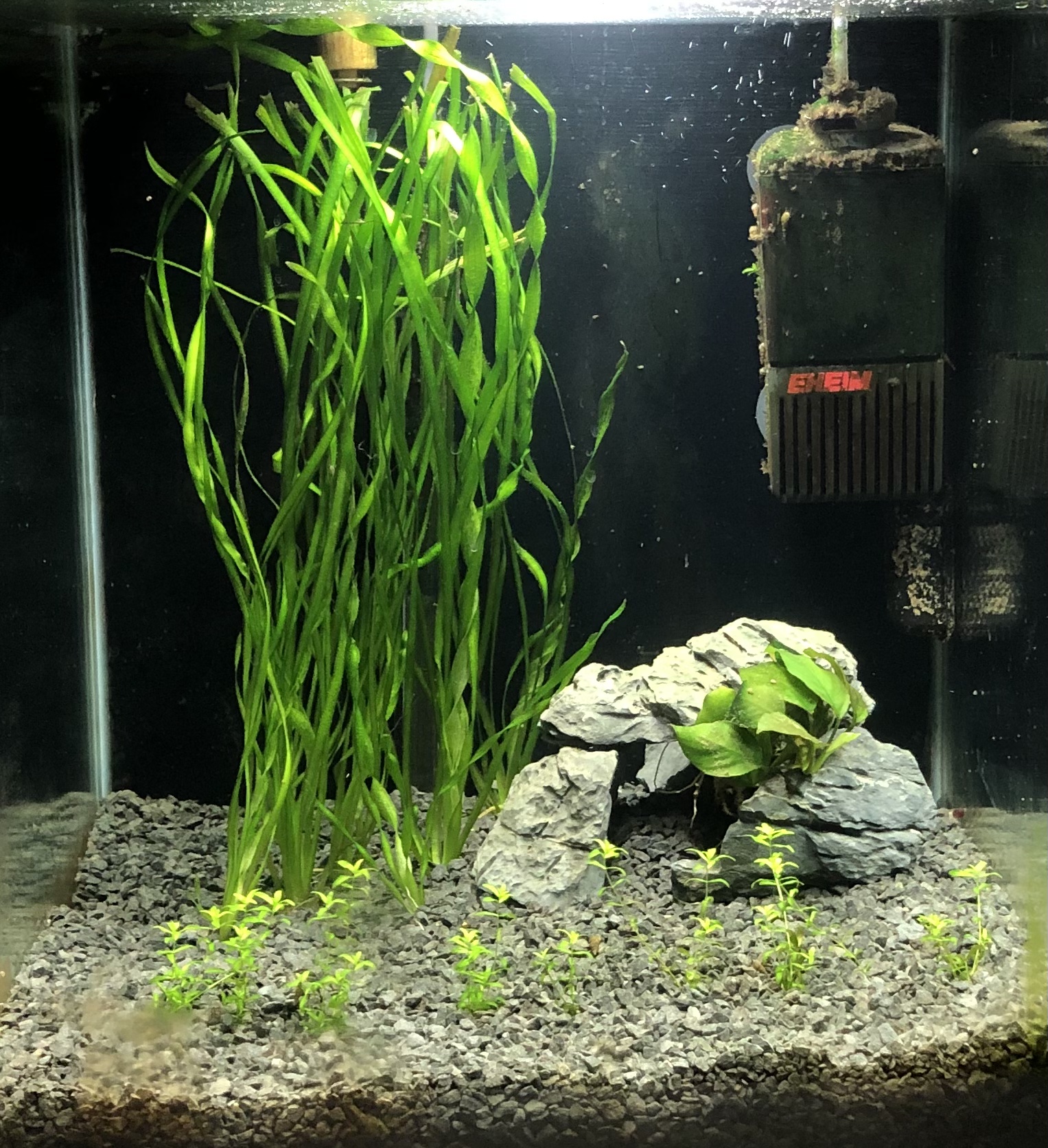 Aiemmin siinä oli meriakvaarion vanha hiekka ja pH järkyttävä 8. Eihän siihen voinut laittaa mitään kaloja. Nyt vaihdoin neutraalin pohjan, mutta kun hanasta tulee näin keväisin pH:n 7,5 vettä, niin eihän tuohon uskalla vieläkään tetroja laittaa. Mikä pikkuakvaarion kala olisi pH-vaatimustensa suhteen ei niin tarkka? Kh on 5.